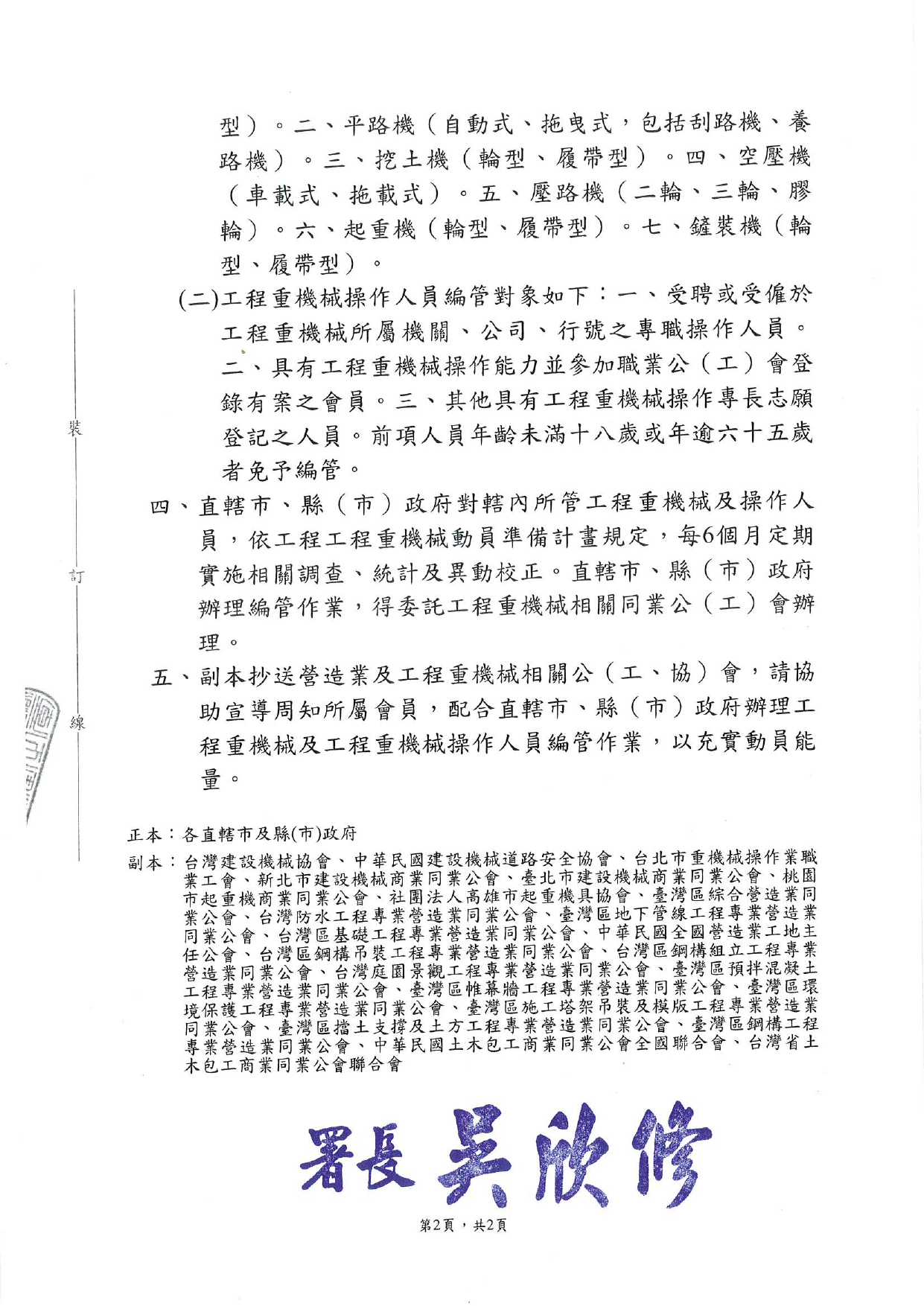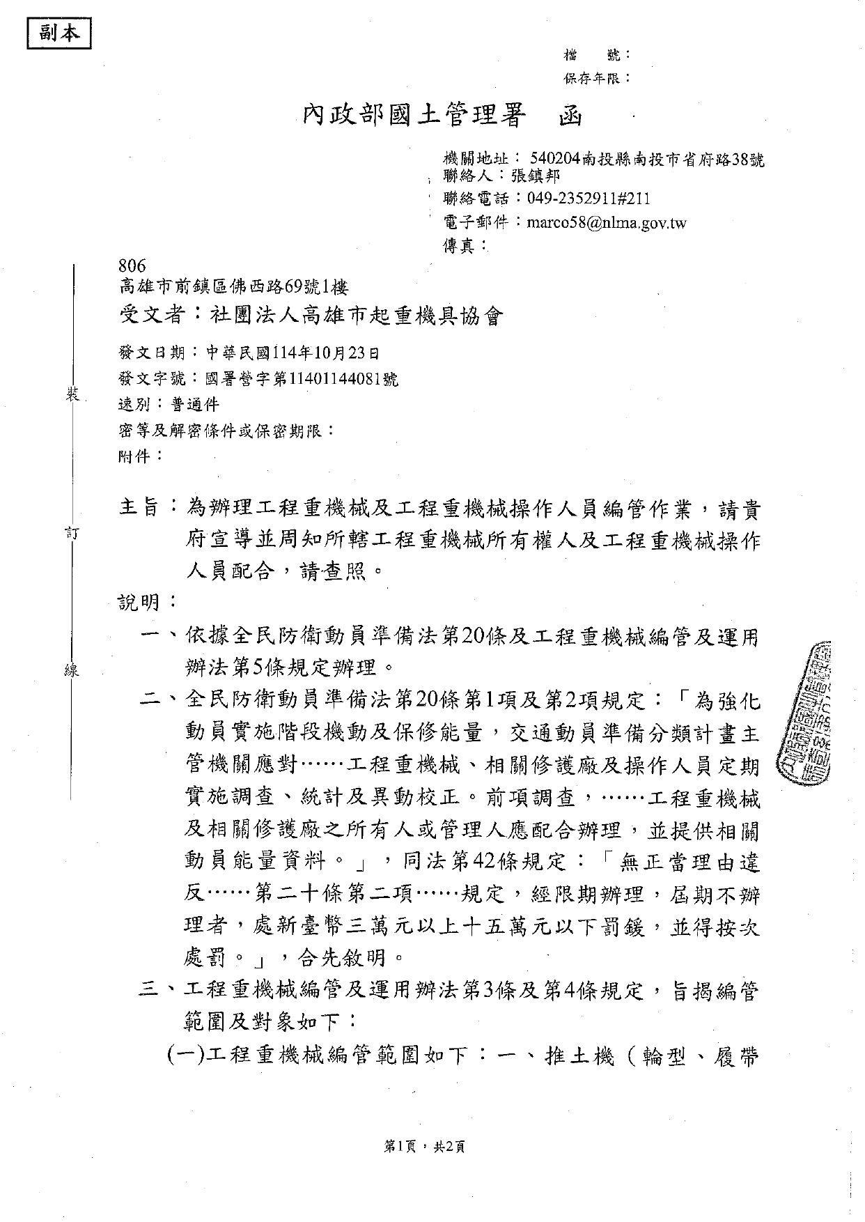 【轉發】國土署為辦理工程重機械及工程重機械操作人員編管作業